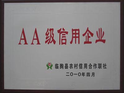 2010年4月,我公司被临朐县农村信用联合社评为AA级信用企业。并且在2012年4月仍然获得此荣誉。